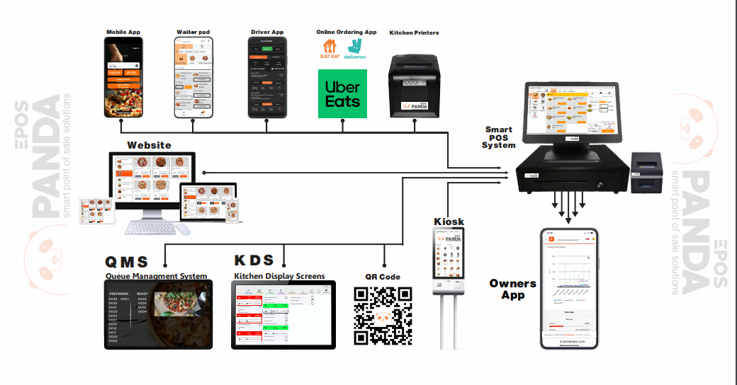 Fully Integrated Smart Point of Sales Systems for Takeaways, Restaurants, Pubs, and Cafés, etc. Panda EPOS has POS Systems, Ordering Websites, Ordering Mobile Apps, Kitchen Display Systems, Self Serving Kiosk, QR Code Table Ordering, Waiter Pads, Delivery Driver Apps, and Bespoke POS Solutions. |